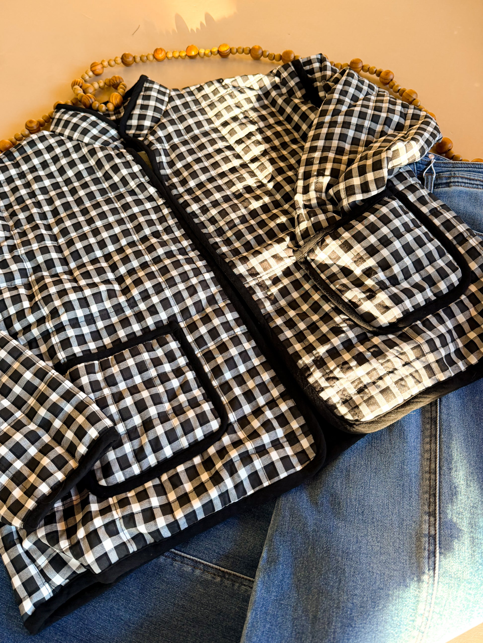 True to size. This lightweight padded coat features a classic black-and-cream gingham pattern with contrast trim for a timeless, elevated look. Designed with a stand collar, long sleeves, and functional front pockets, it offers cozy warmth without feeling bulky. The soft cotton fabric and quilted padding make it perfect for layering through transitional seasons. Easy, comfortable, and effortlessly stylish—this is the grab-and-go layer your fall and winter outfits need.
