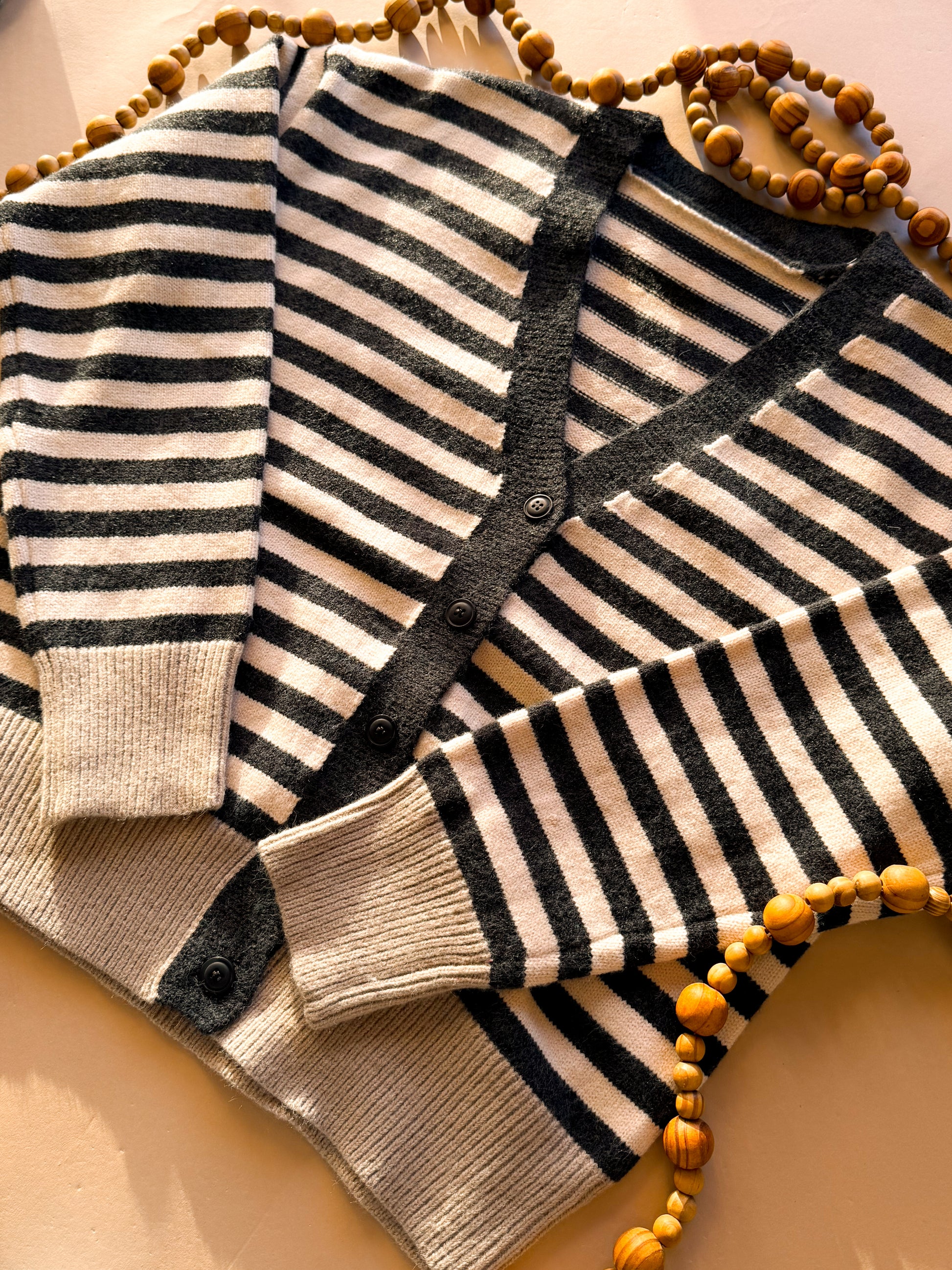 True to size. This classic button-front cardigan features a timeless striped design with soft colorblock contrast for an elevated everyday look. Designed with a flattering V-neckline, functional buttons, and ribbed cuffs and hem, it offers a comfortable fit that’s easy to layer. The soft knit feel makes it perfect for wearing open over a tee or buttoned up as a top. Effortless, versatile, and endlessly wearable.